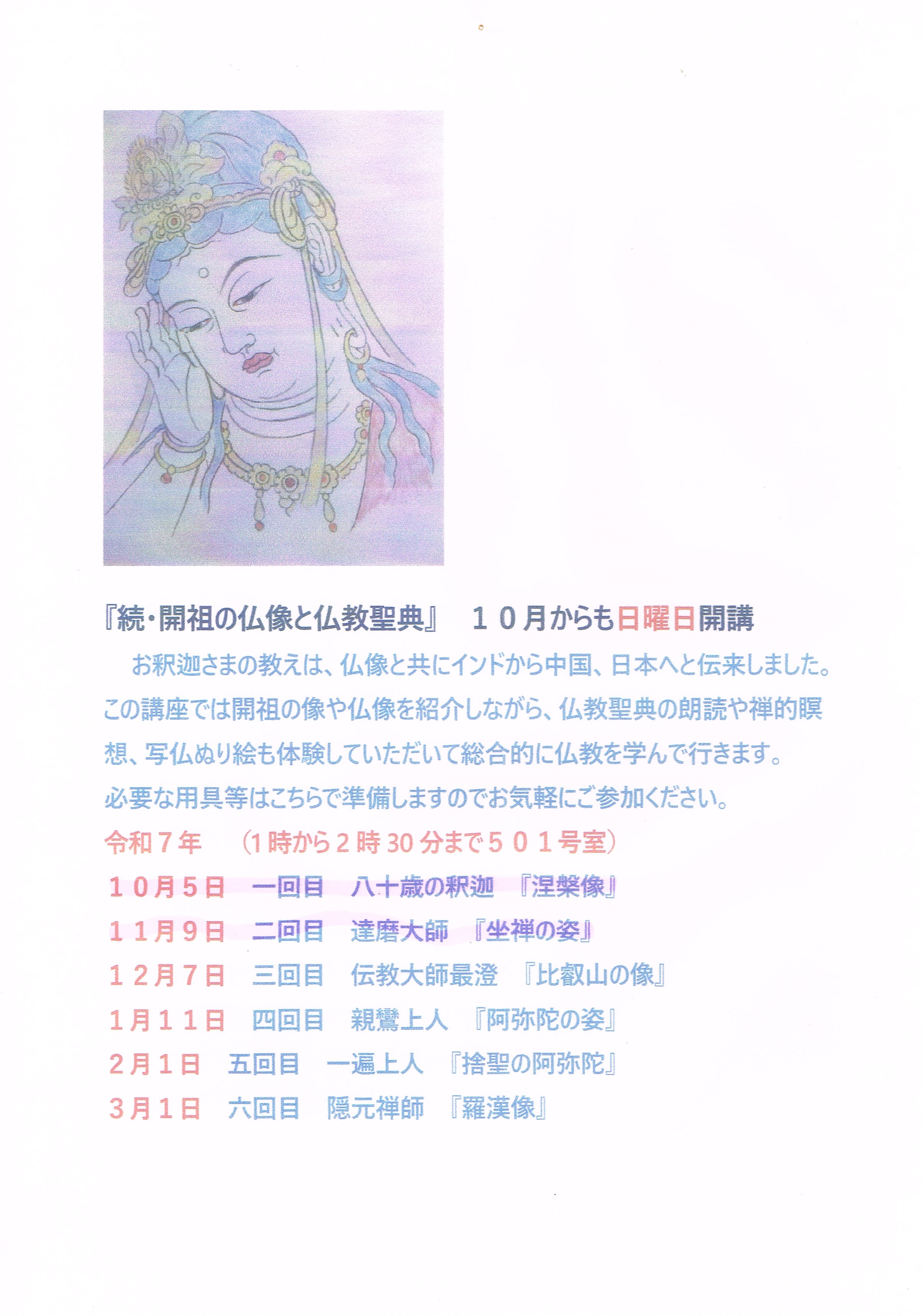 道新文化センター新講座『開祖の仏像と仏教聖典』は令和7年4月6日(日曜日)午後1時から午後2時30分まで月一回の半年コースです。詳しくは道新文化センター☎011-241ー0123までお問い合わせください。30分程の見学も出来ます。